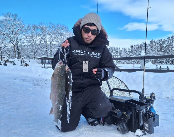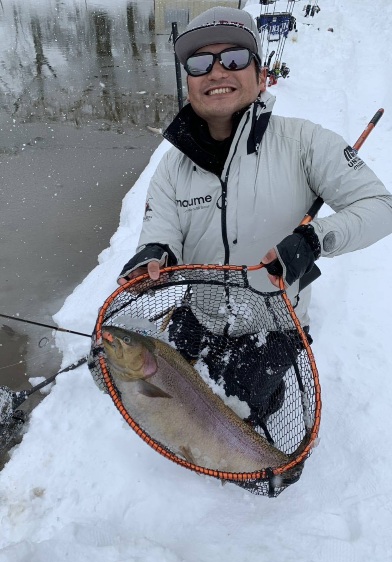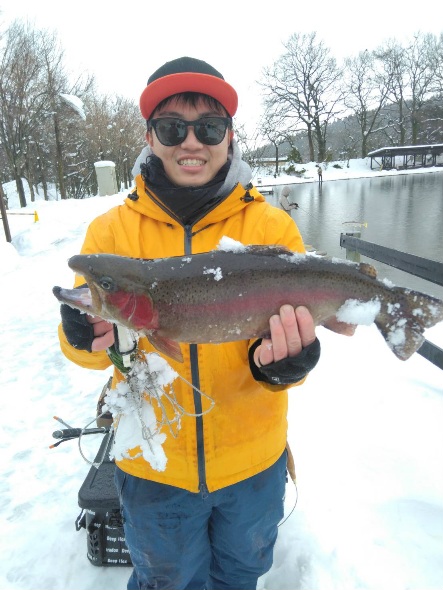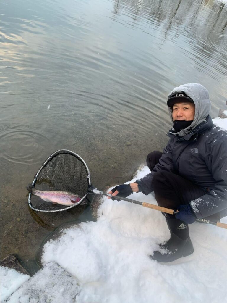 雪が降ったり止んだりの五頭FPでした。お客様は少なく、午後は更に少なかったです。風は無く釣りができたのが良かったです。 今日の一番は、超・極太の大型が釣れ驚きました! 朝は放流魚…