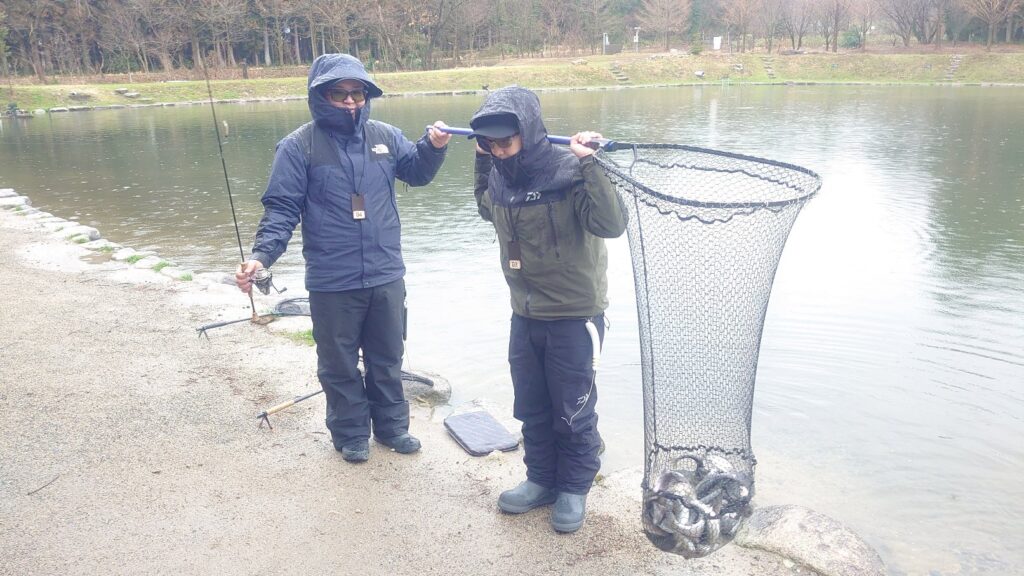 午前は雨が降ったり止んだり、午後も雨の降る時間がありました。お客様も少なかったです。 チェリートラウト効果で数も釣れましたが、残存魚の超大物も午前午後と釣れました。しかも極太です! …