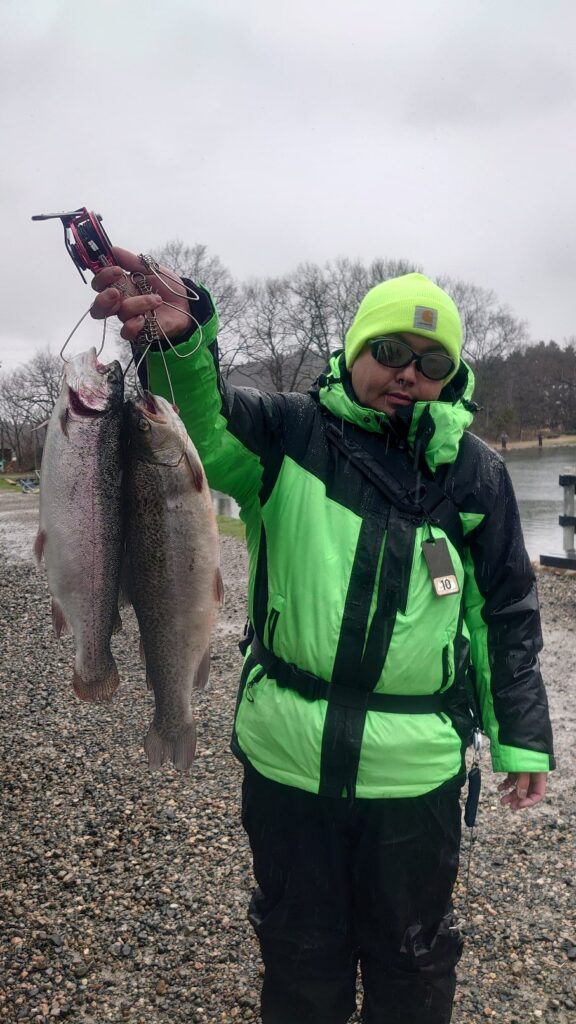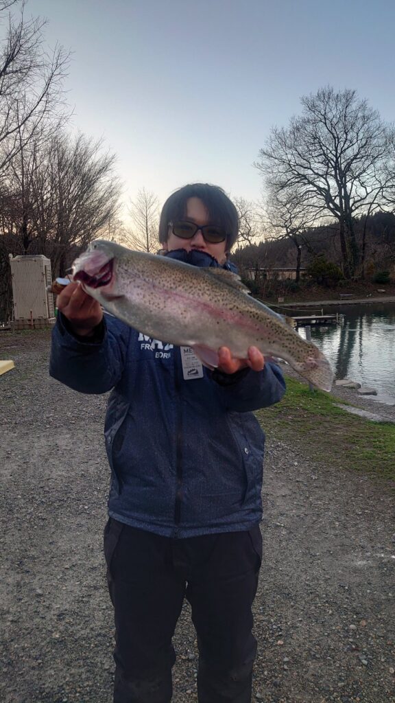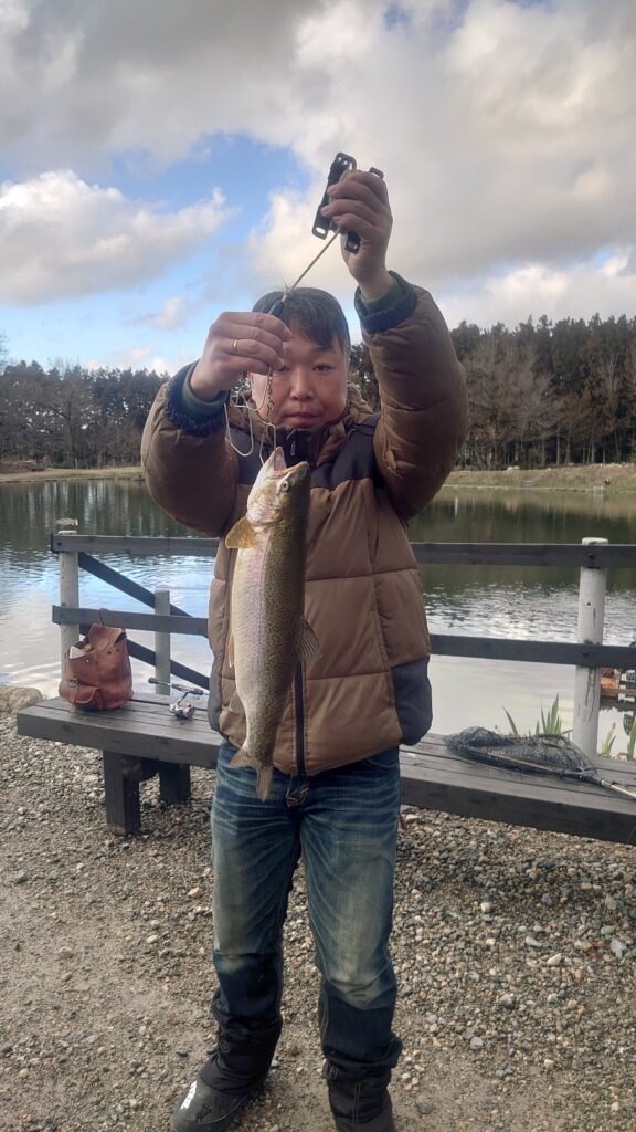 ご夫婦で大型GETしてました。これで沢山の鱒料理が出来ますね。この時期は低水温で魚も元気で脂のりもいいので美味しいですよ!川ではサケが取れず、スーパーではサーモンの価格が値上がりしてます。ここは、ぜひ五頭FPで高級魚の極上サーモンを釣って帰りましょう!