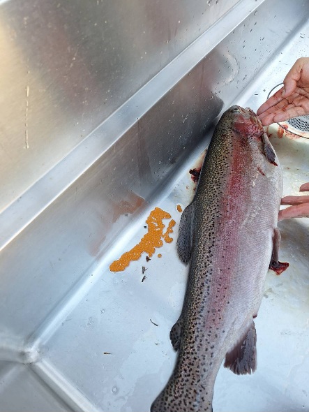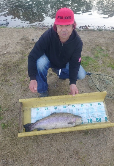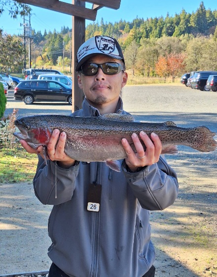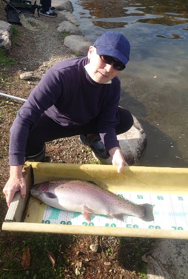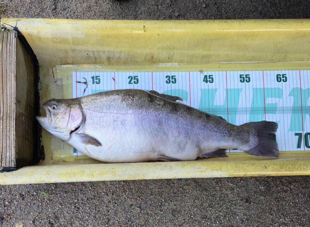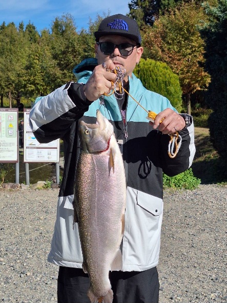 朝のスタートは放流したレギュラーサイズが釣れ、その後に大型魚のレインボーサーモンやロックトラウトが釣れました。