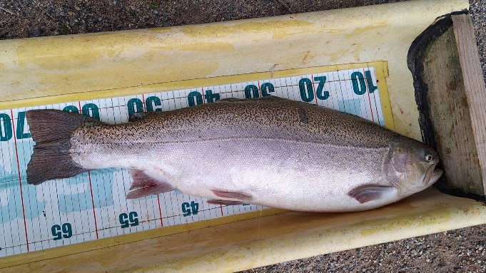 大物が釣れました!50cm~60cmUPの大型レインボーサーモンや大型ロックトラウトが釣れ、本日の最大は69cmの大型ロックトラウトでした!重さも5.2kgで極太です。ビックワントーナメントの暫定1位となりました!おめでとうございます。今年の大型魚は4~5キロ以上と極太の魚が多く釣れています。イクラたっぷり入りの大型魚も釣れます。