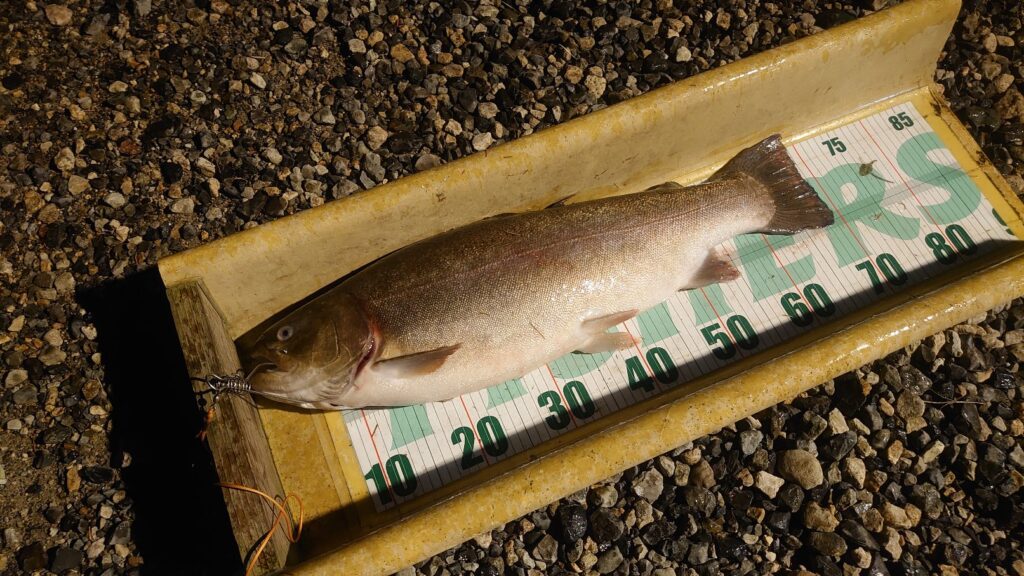 午後も良いサイズ釣れてます!こちらも綺麗なヒレピンの69.5㎝5㎏クラスです。惜しいサイズですが脂の乗ったいいロックトラウトです。まだまだ残存はいっぱい残ってますので狙ってみてください。