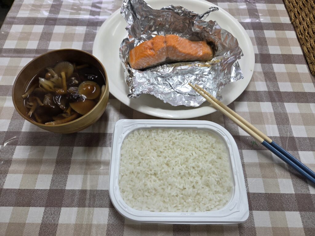 朝食まかない飯は、大型レインボーサーモンの塩焼き、長野県産のキノコ汁です。五頭FPのサーモンは肉厚で旨味が凄いです!