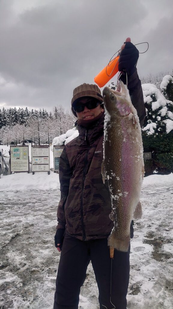 昨晩、降った雪は程々に済みました。朝は冷え込みが強くなり、水温も低いまま安定してました。その為、放流のレギュラーより、大型ロックトラウト、大型ニジマスの反応が良かったです。