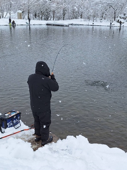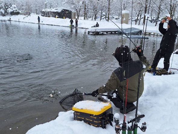 昨日は、雪が降らず安心していましたが、今日は雪が降ったり止んだりの1日となりました。早朝に除雪が入り、駐車場や池の周りは綺麗になっていました。雪でお客様は少なかったですが、放流はしっかりといたしました。
